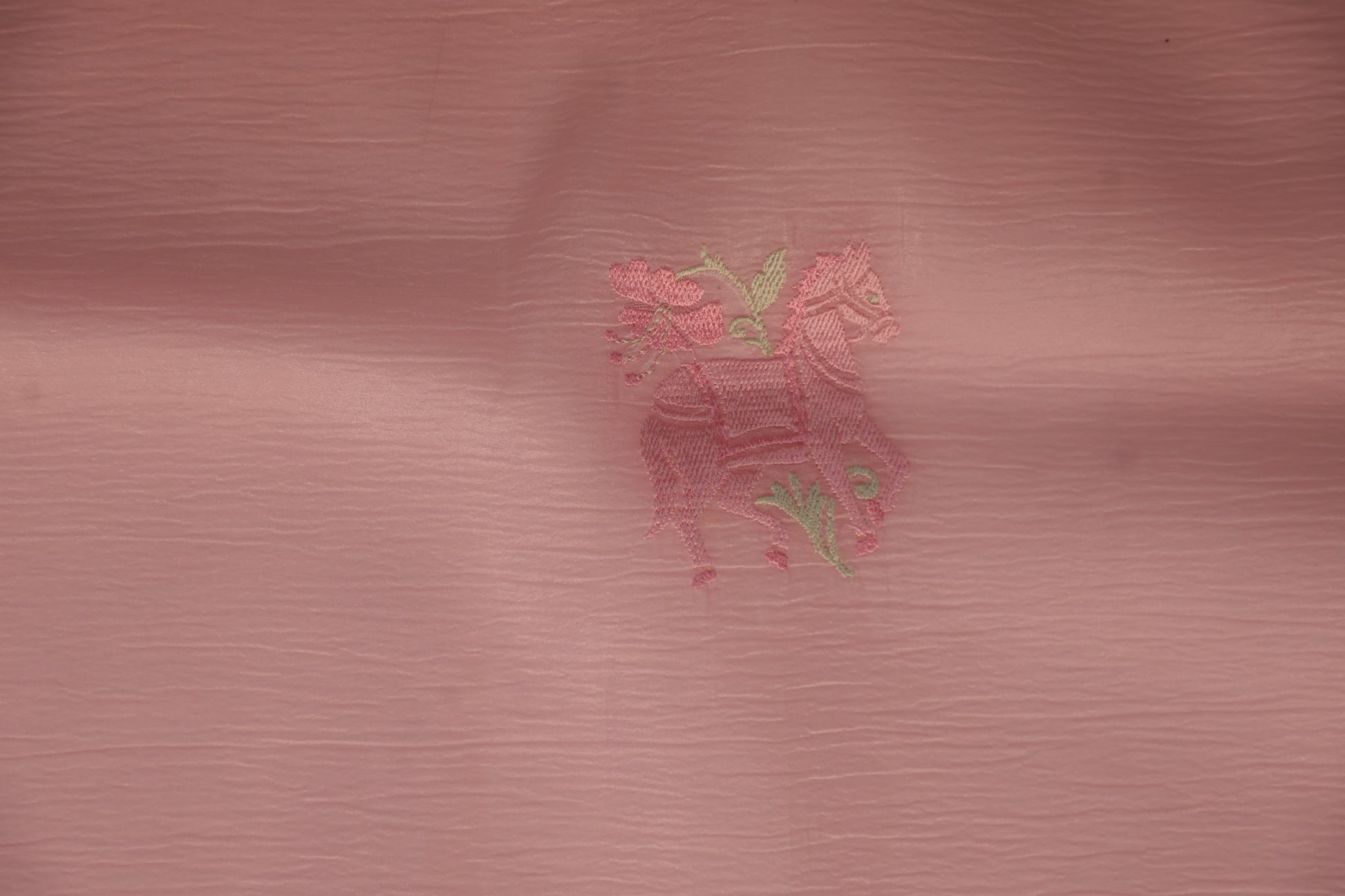 Wrap yourself in cotton candy dreams with our Baby Pink Crush Tissue Saree! Prancing horse motifs gallop playfully across the fabric, while flirty scalloped borders twinkle with delightful beadwork. The matching blouse piece is ready for your styling magic! This easy-peasy-to-drape beauty hugs you in the sweetest shade of pink that'll make pastel lovers go weak in the knees. Be prepared for "oohs" and "aahs" wherever you go—because this blush-worthy shade ensures you're the prettiest pop of color in any room!