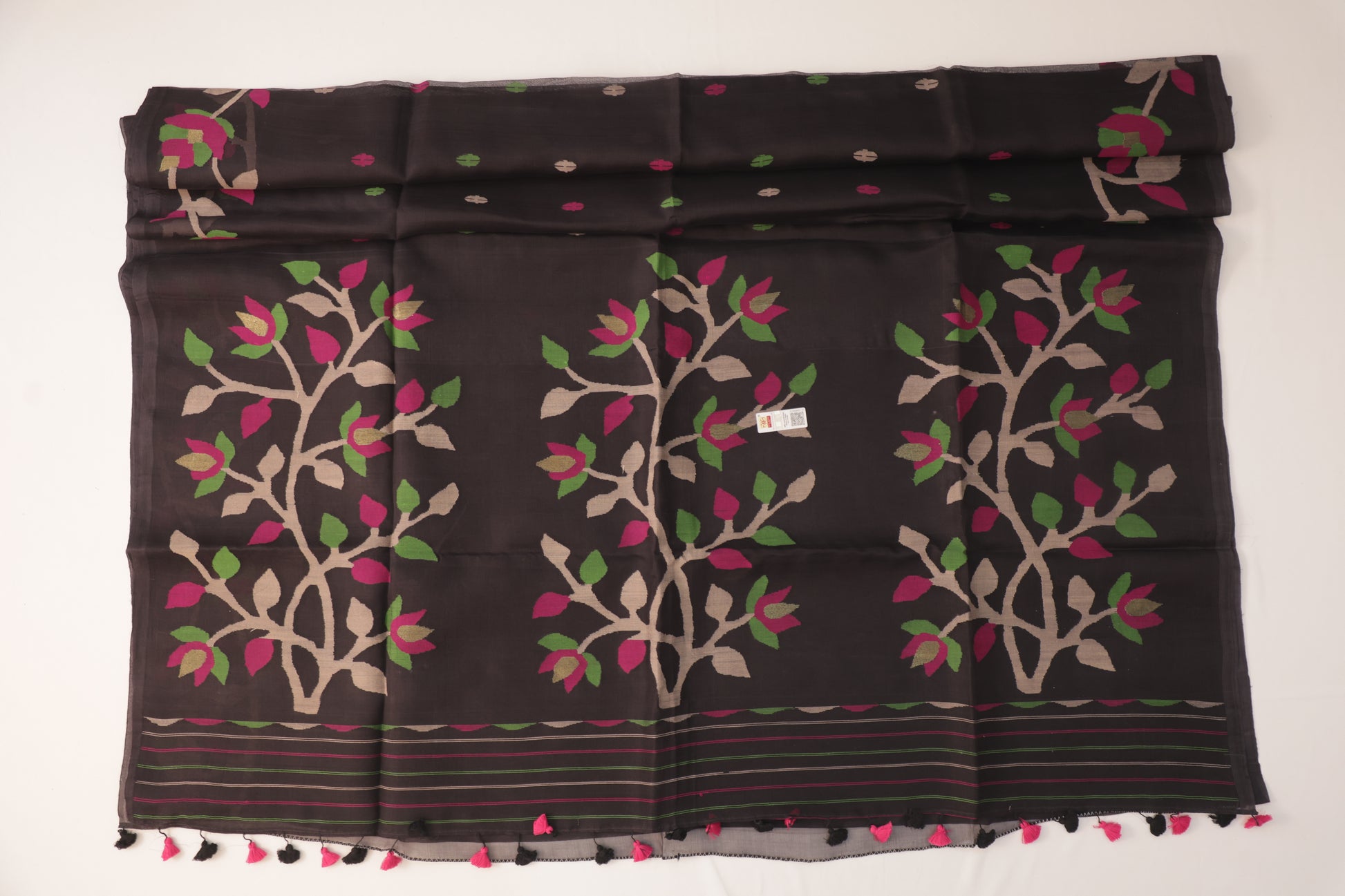 Dare to command attention in this bold Black Muslin Silk Jamdani Saree. The dramatic noir backdrop becomes a canvas for rebellious green and pink Jamdani weaving that defies convention, strategically placed to accentuate both body and palla. This isn't just a saree—it's a statement for the unapologetically confident woman who knows black isn't just a color, it's an attitude. Break the rules at your next gathering with this showstopper.