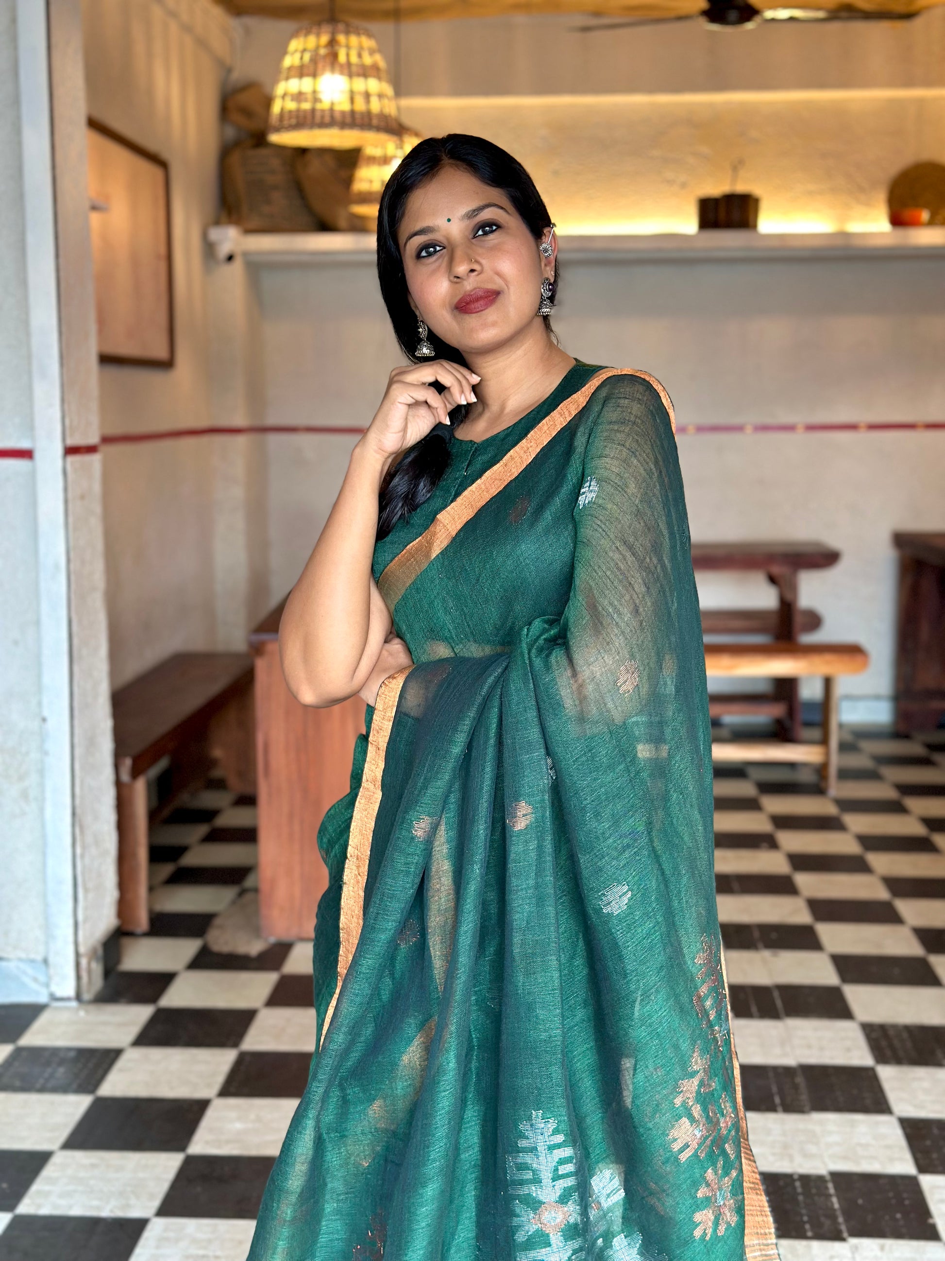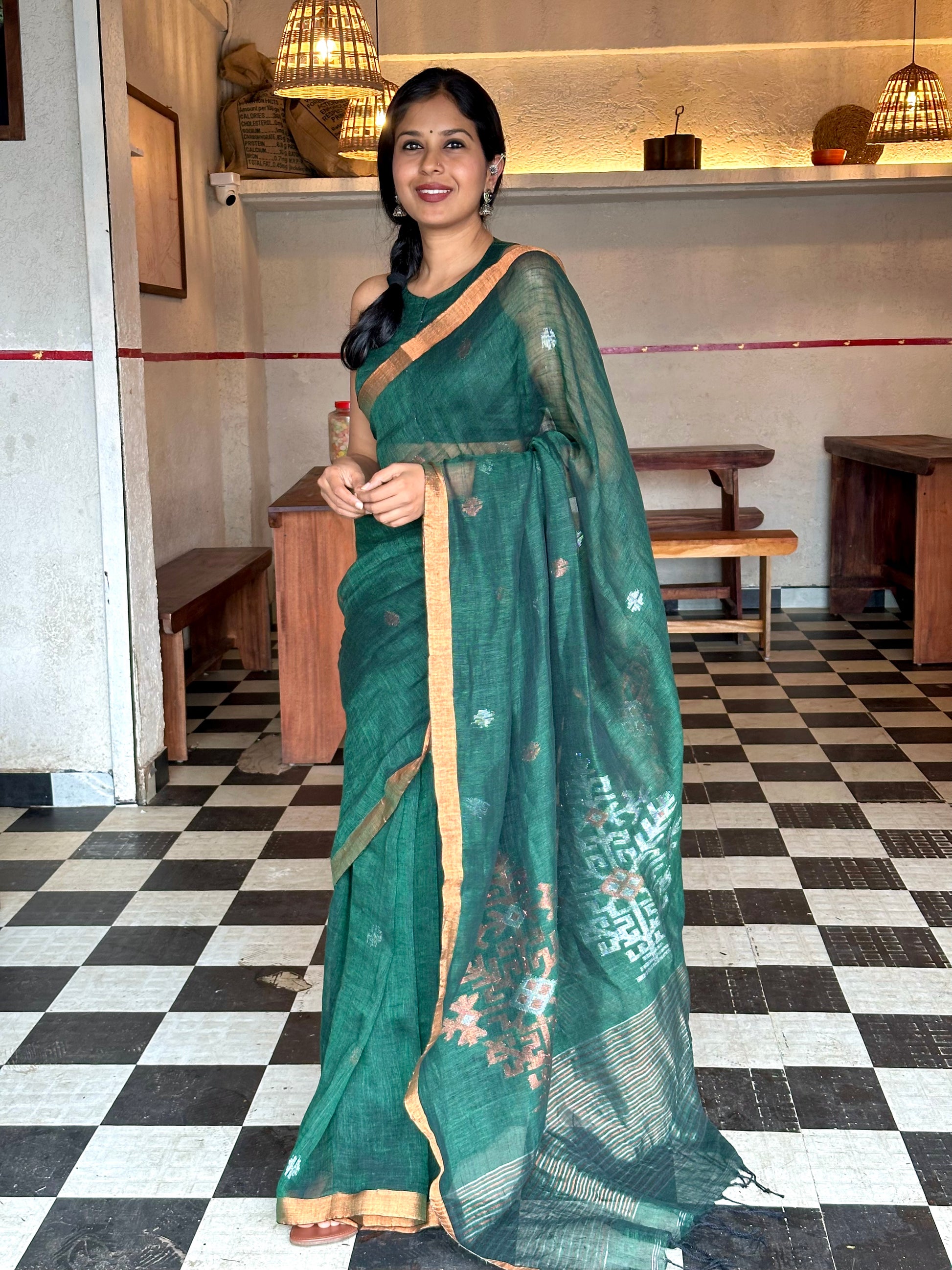 This Linen saree with small buttas weaved into the body of the saree and stunning weaving pattern in the palla is the epitome of understated elegance. Made with high-quality linen, this saree offers comfort without compromising on style. It comes with a running blouse piece of the same shade.