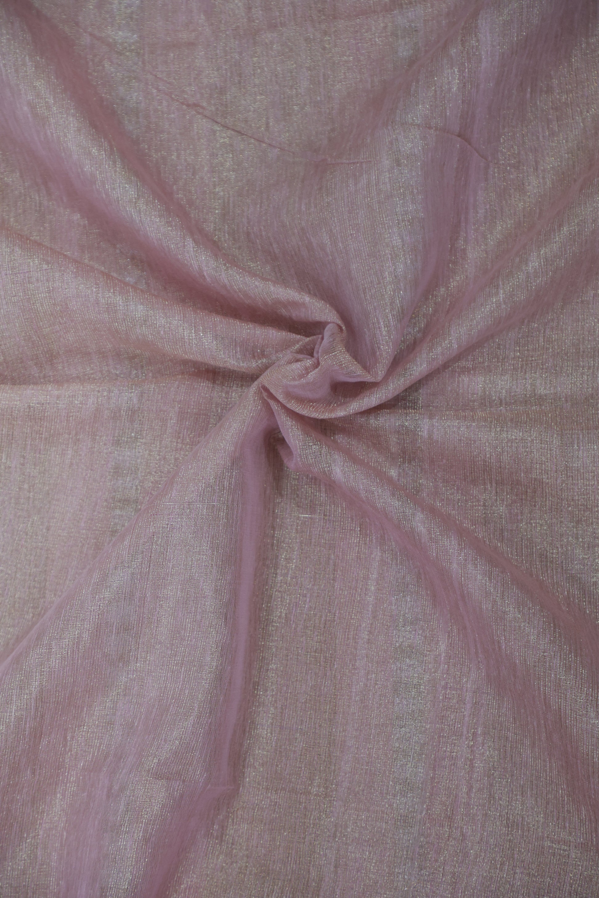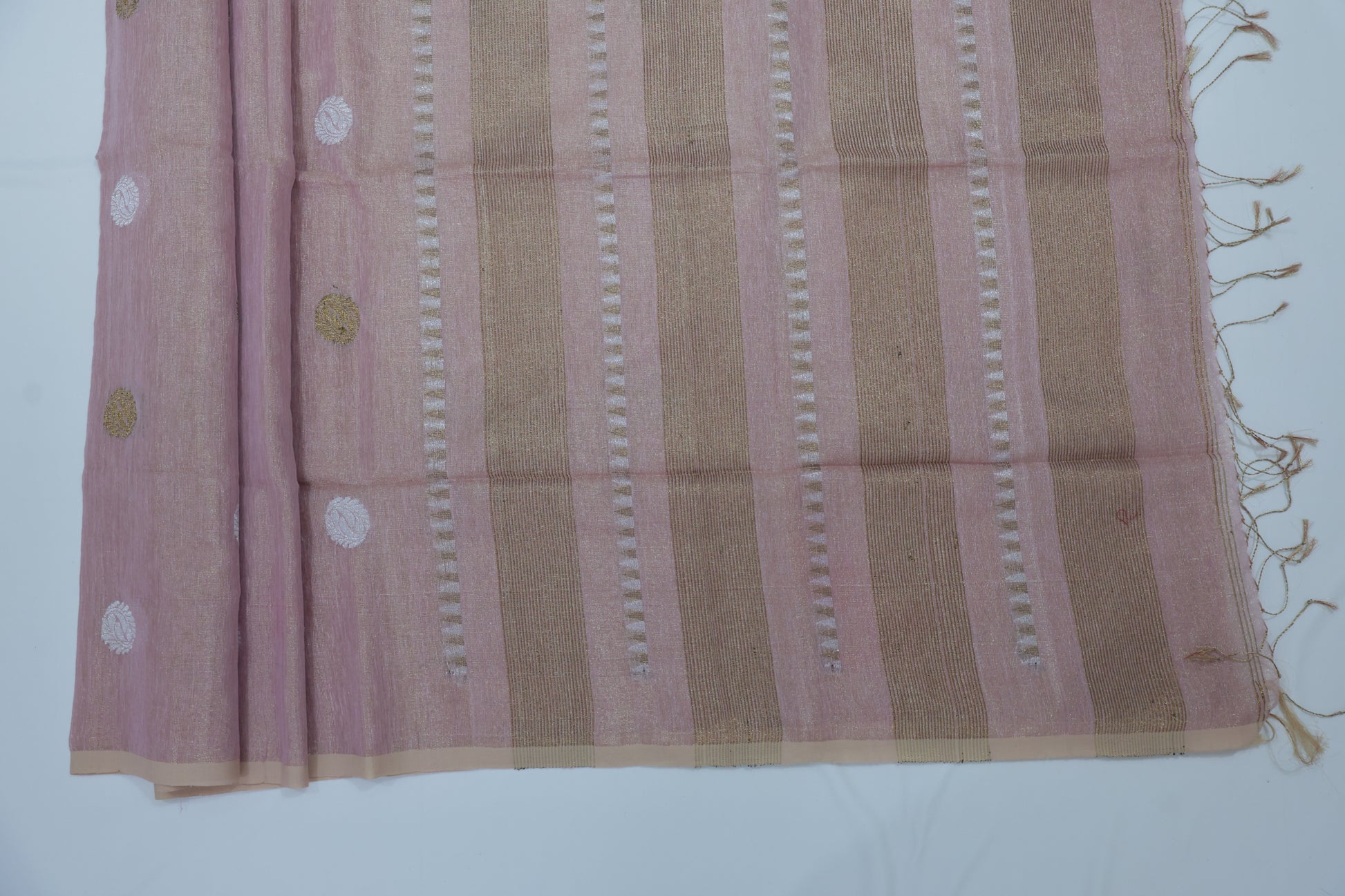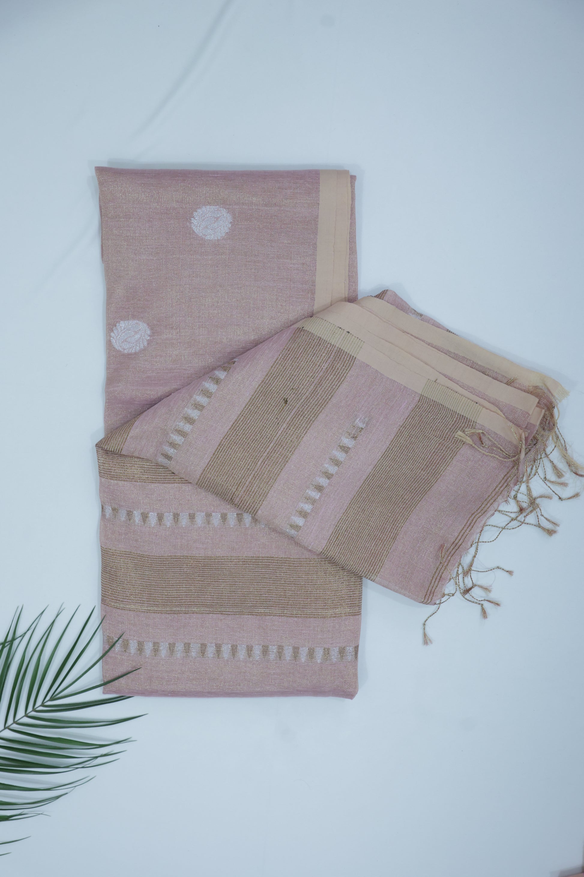This elegant Tissue Linen saree in a delicate lavender hue features handwoven round buttas in shimmering gold and silver tones scattered gracefully across its body. The palla showcases refined stripes and a temple border design in matching shades, adding a touch of traditional artistry. Perfect for those who appreciate subtle sophistication and timeless craftsmanship.