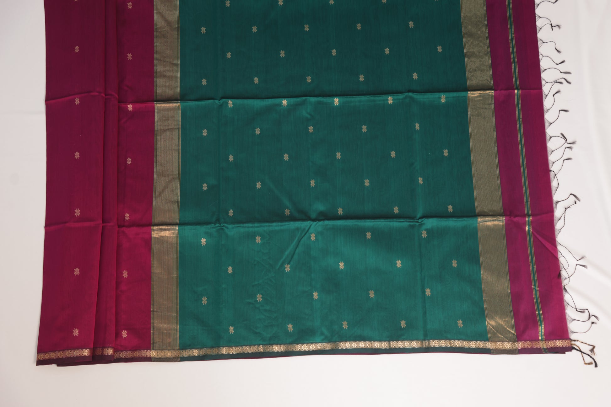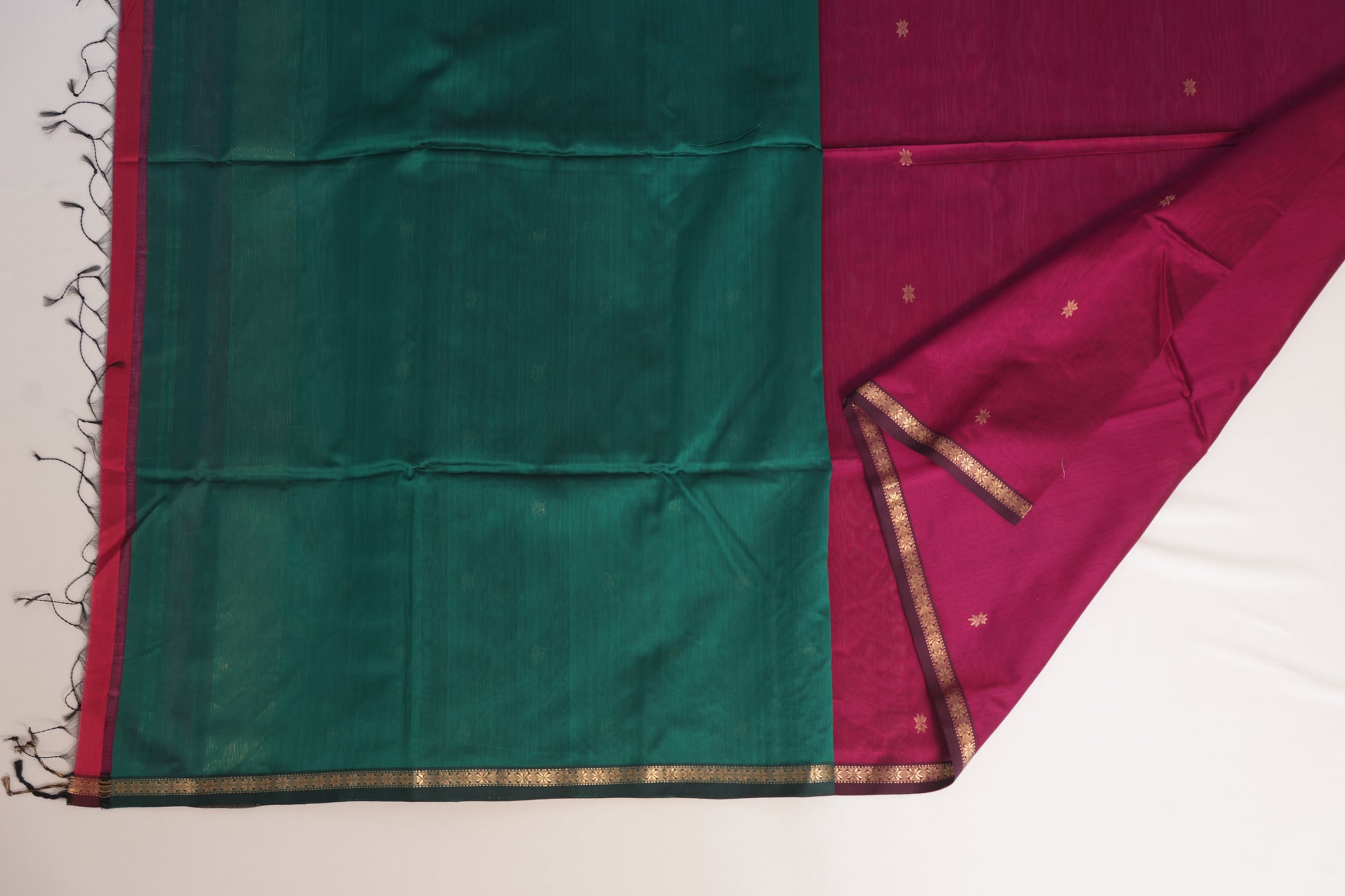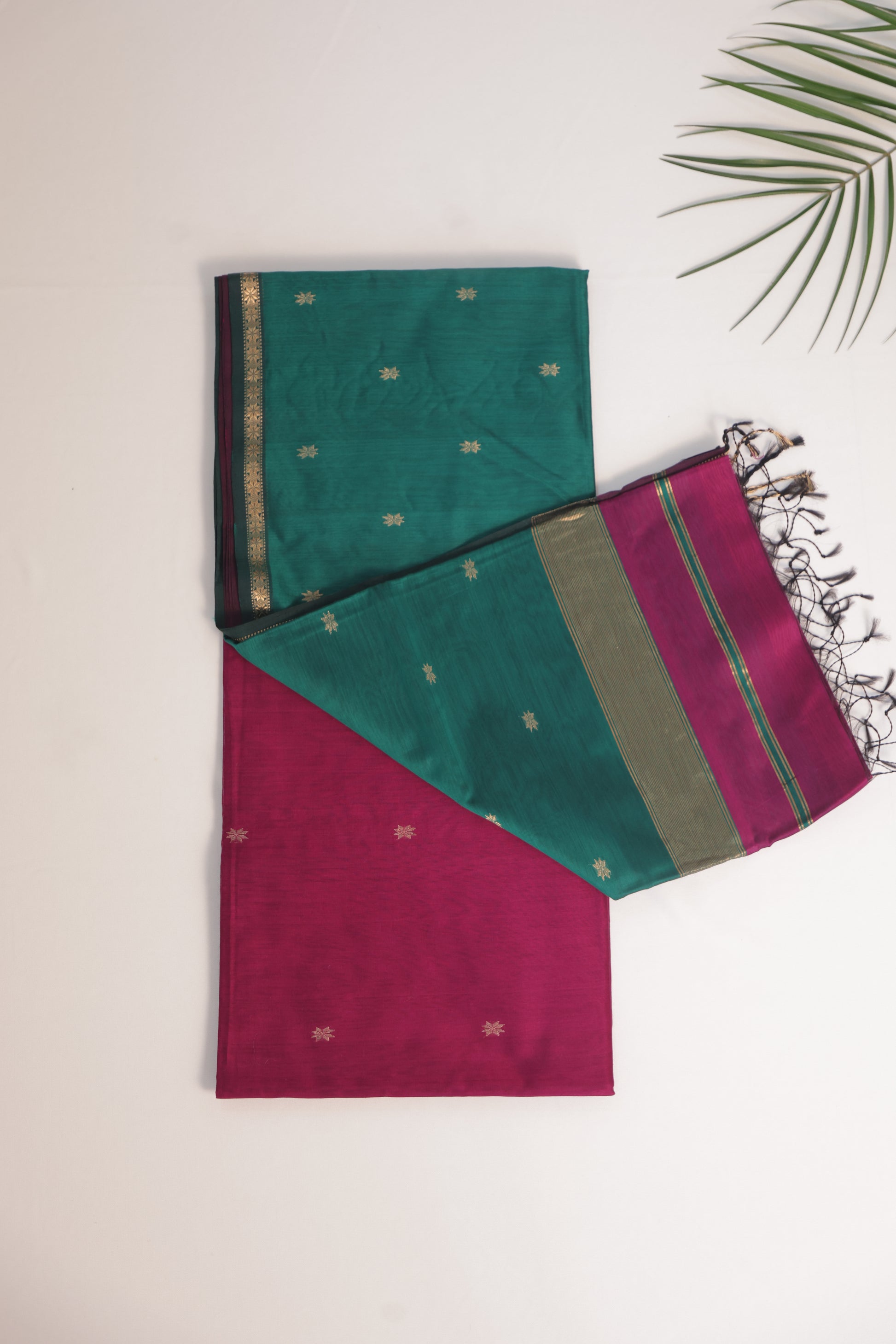 Unleash your bold style with this striking Purple and Green Maheshwari Handloom Saree. The vibrant purple body dramatically contrasts with the rich green palla, while delicate handwoven buttas add an element of intrigue. Crafted in luxurious silk cotton blend, this head-turning ensemble includes a matching green blouse piece—perfect for making an unforgettable statement at your next special occasion.